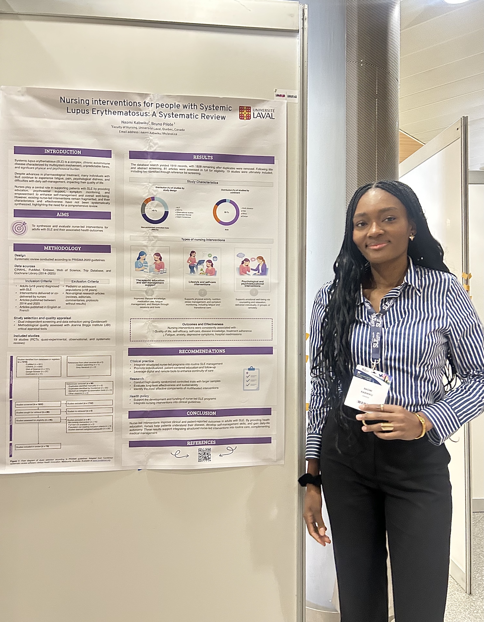 👏 Nous félicitons Mme Naomi Kabwiku, qui y a présenté une affiche sur sa revue systématique des interventions infirmières. Mme Kabwiku est en train de lancer un projet dans le contexte de son doctorat sur les autosoins dans le lupus.