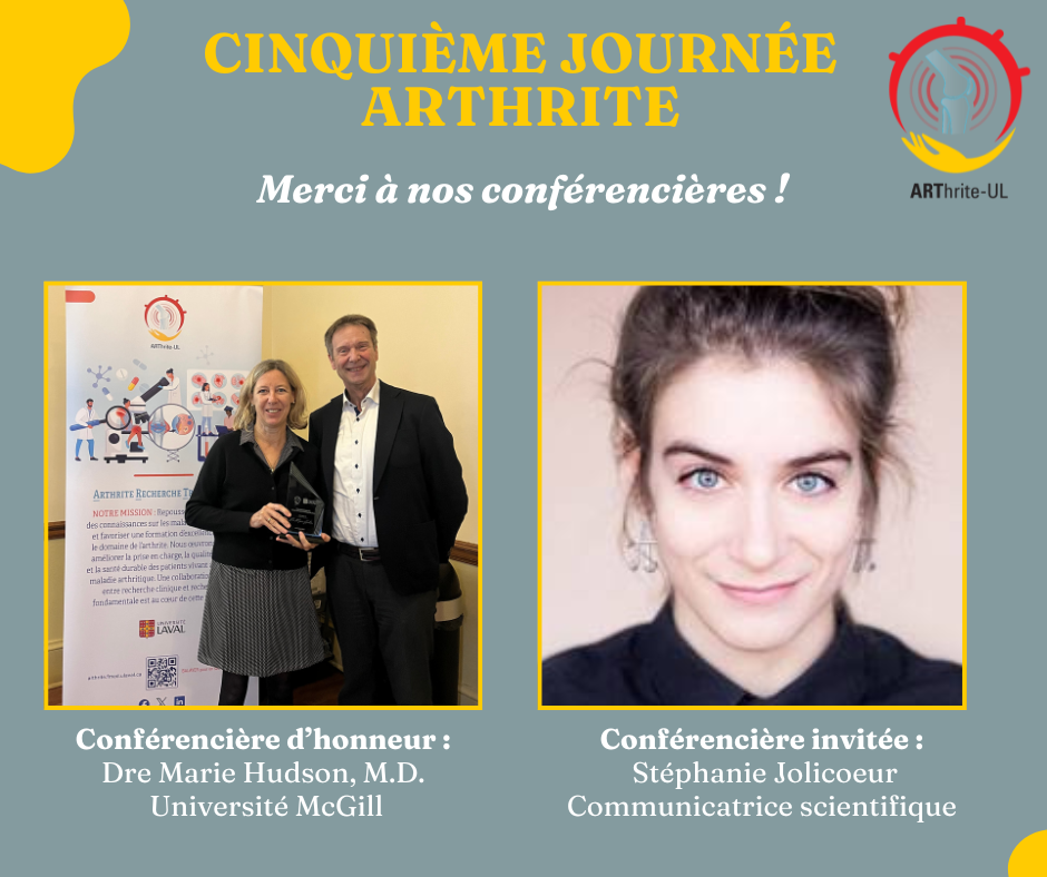 Nous adressons nos sincères remerciements à nos conférencières, Dre Marie Hudson et Stéphanie Jolicoeur, ainsi qu’à nos partenaires : UCB Canada, AstraZeneca Canada, Amgen Canada et Wisent. Un grand merci également à toutes les personnes présentes !